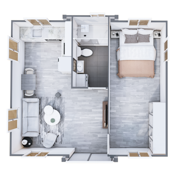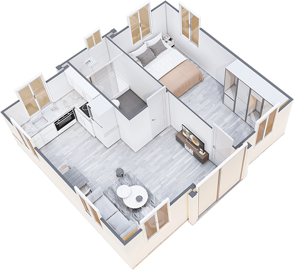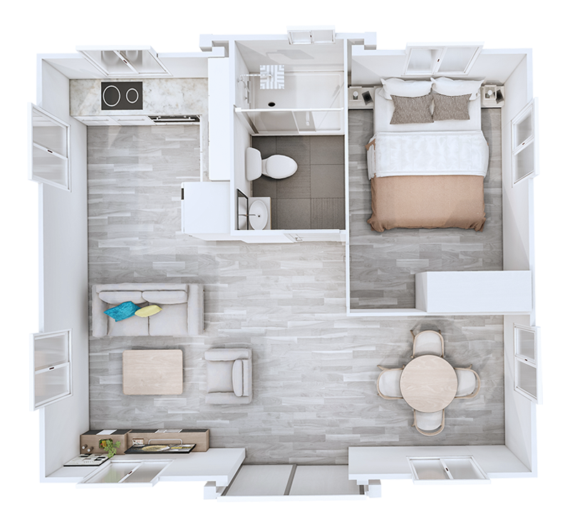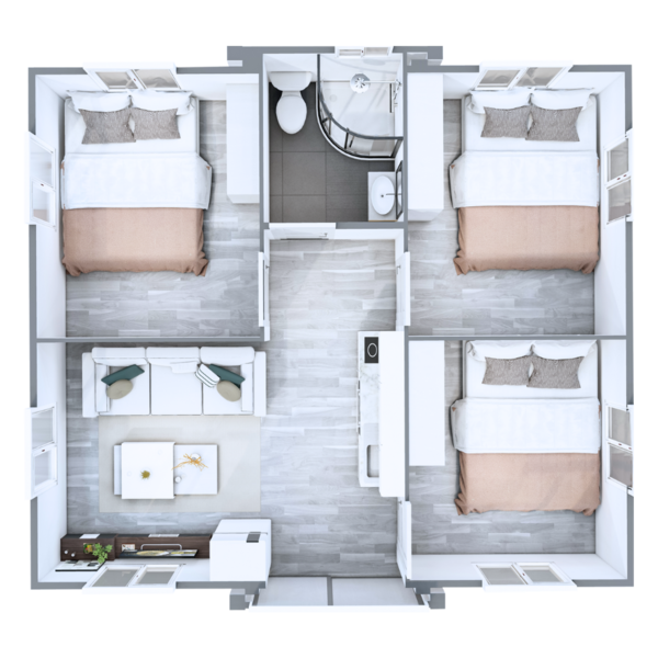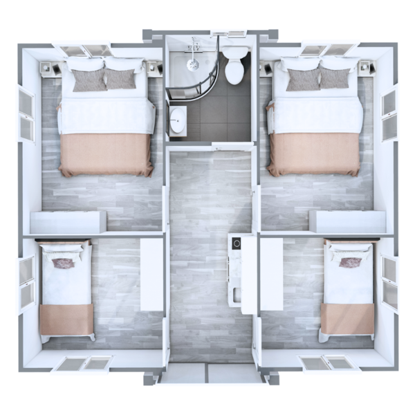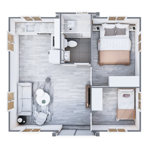 The floor plans of our Premium Tiny Homes offer a comfortable and relaxed living experience while maximising the use of space and natural light. We have 4 unique floor plan options with 1, 2, 3, and 4 bedrooms, living space, kitchenette, and bathroom with shower + toilet.