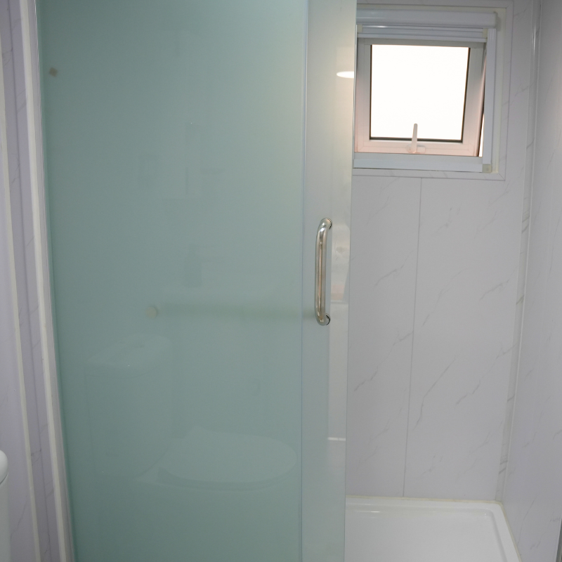 Full-width shower, shower rail, rainmaker shower head and frosted privacy glass door